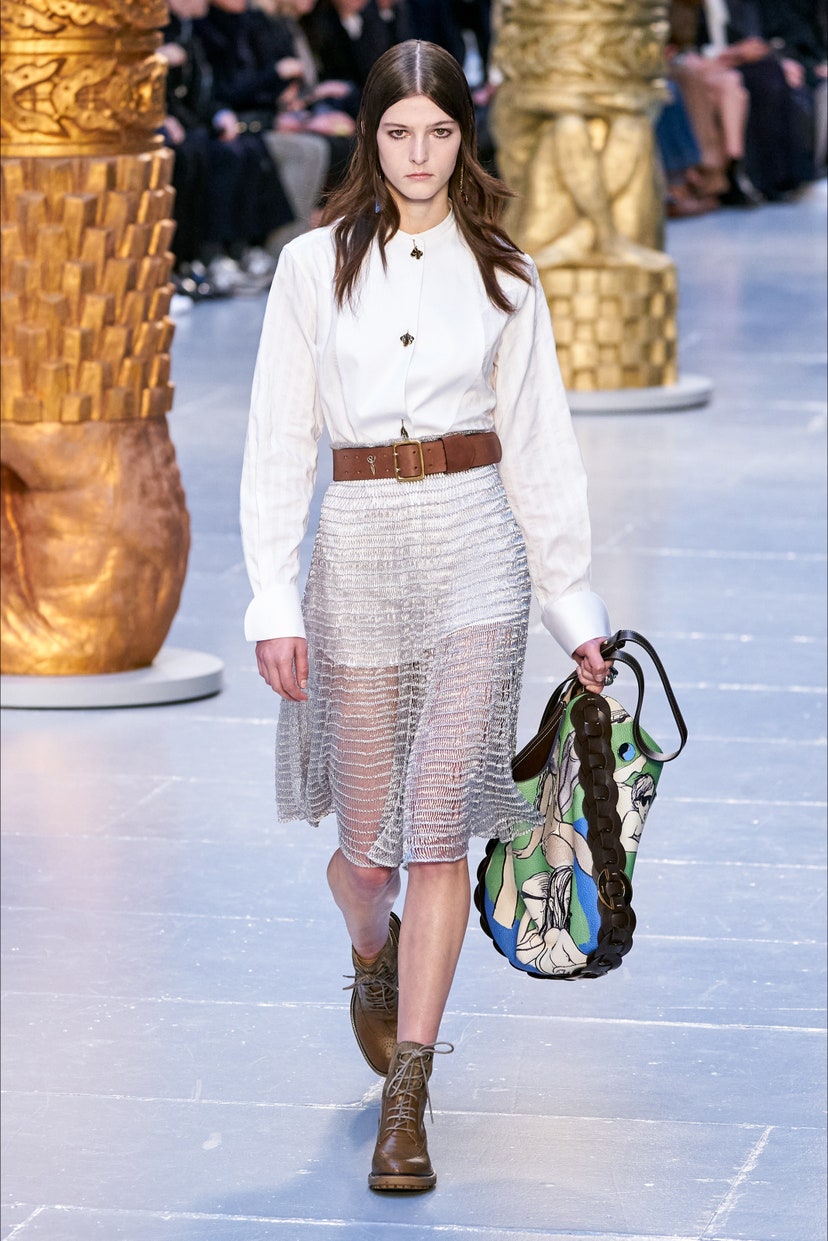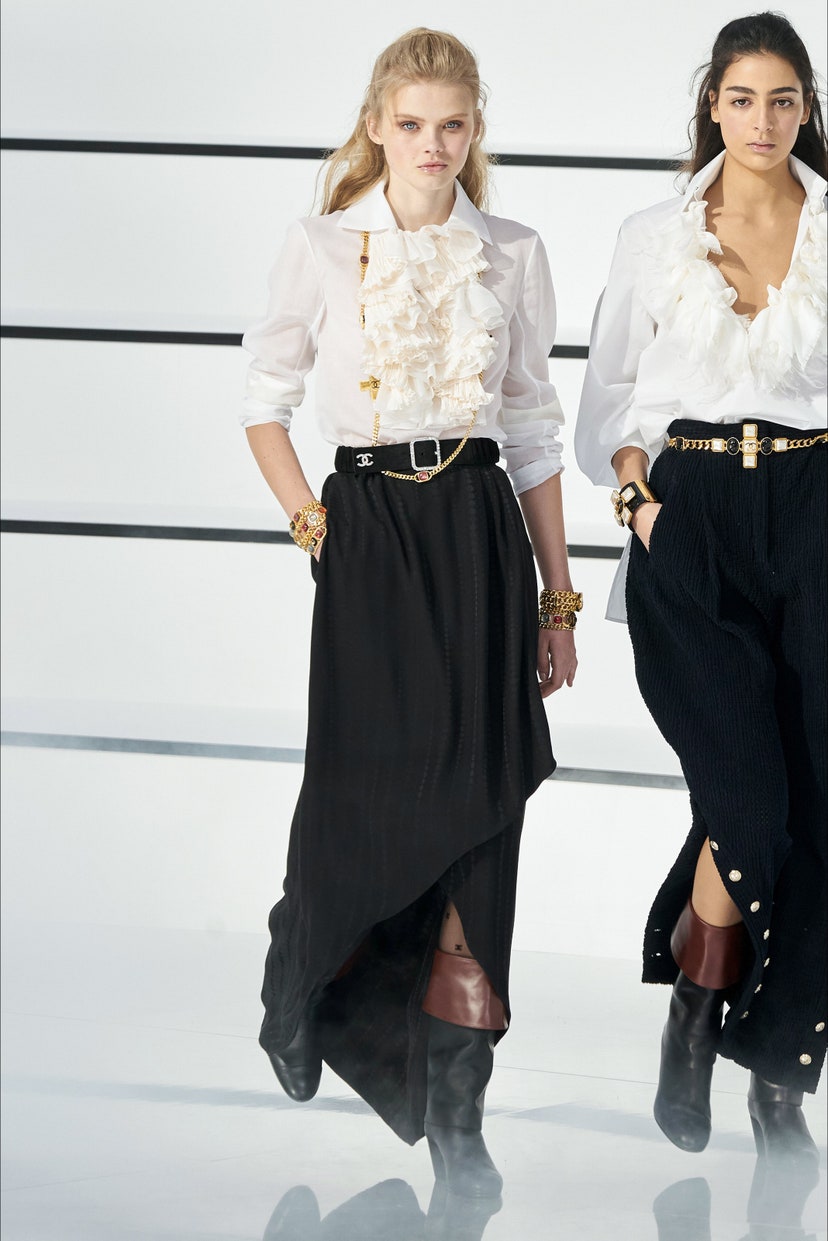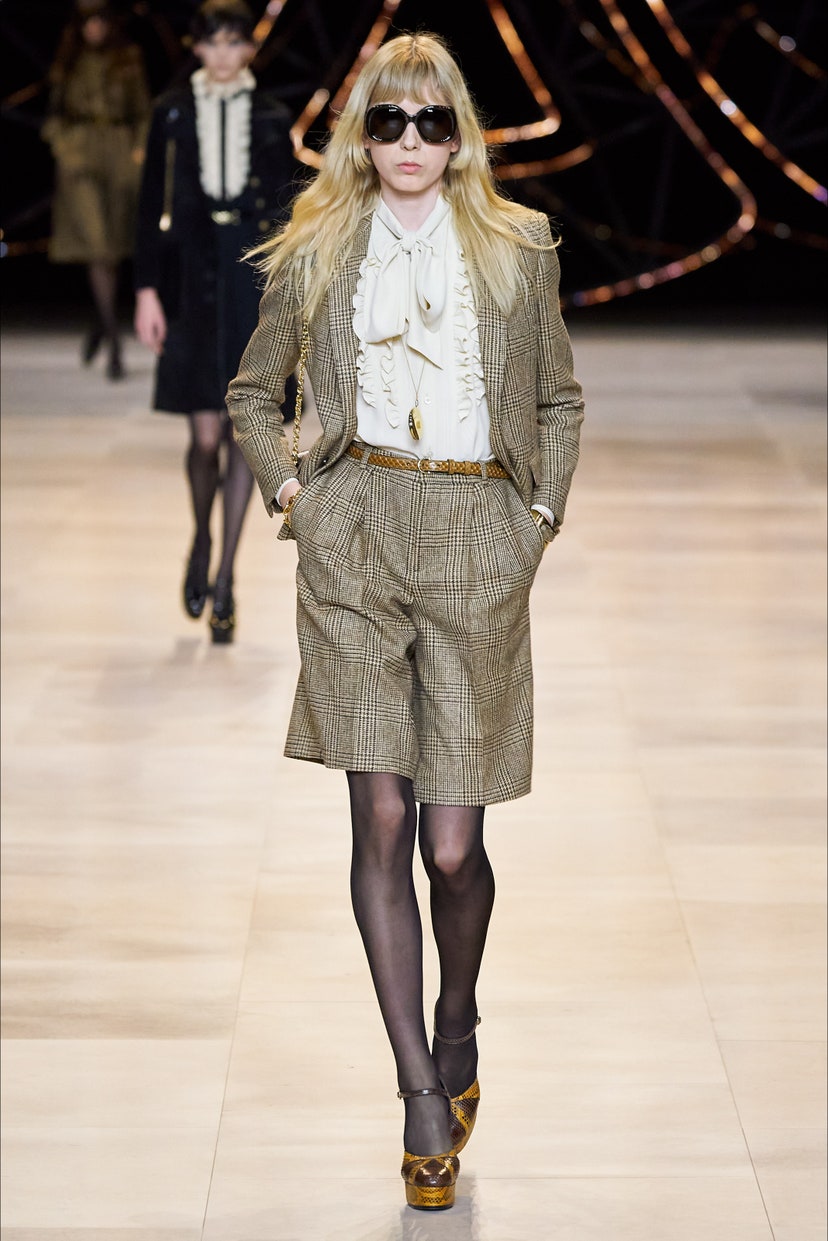 셀린느의 70년대 부르주아적 접근으로 정교한 장식이 달린 화이트 셔츠에 프레티 스타일의