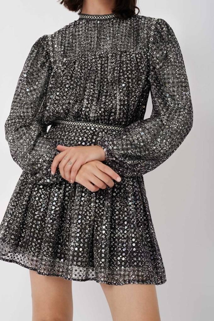 카라, 허리, 어깨에 실버 컬러의 시퀸 디테일이 포인트로 크리스마스와 연말을 맞아 부츠 또는 하이힐과 함께