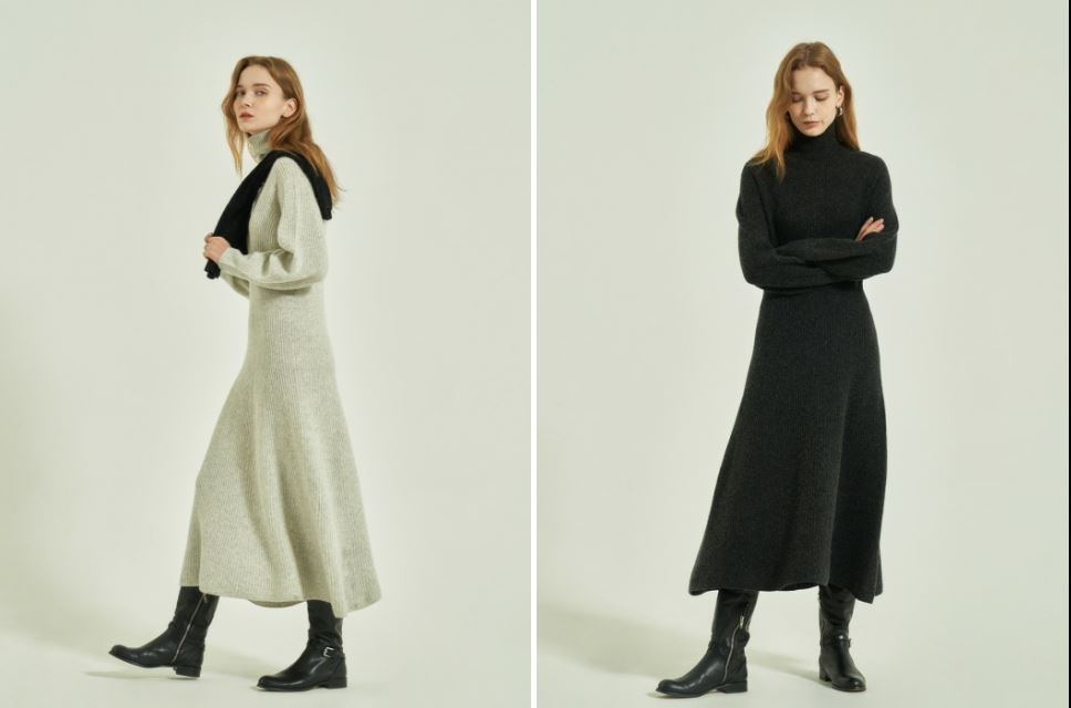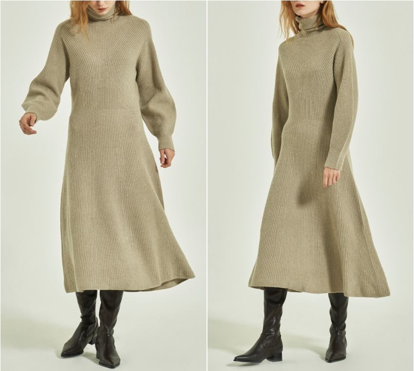 홀가먼트 방식으로 짜여진 니트 원피스이며 캐시미어 울 혼방으로