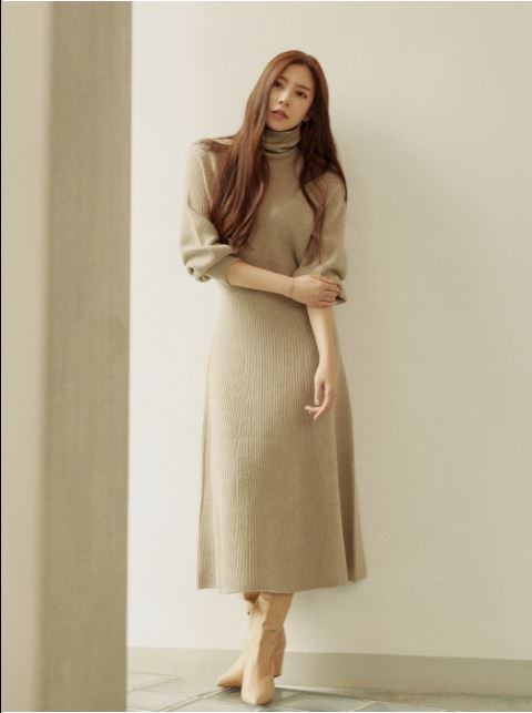 터틀넥 디자인의 롱 니트 원피스를 착용하고 나왔는데요