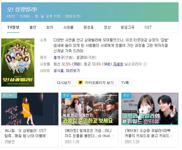 주말 시청률 1위! 3월에 후속 방송 이야기가 나오는 거 보니 오! 삼광빌라! 도 이제 막바지로 달려가고 있는 것 같네요