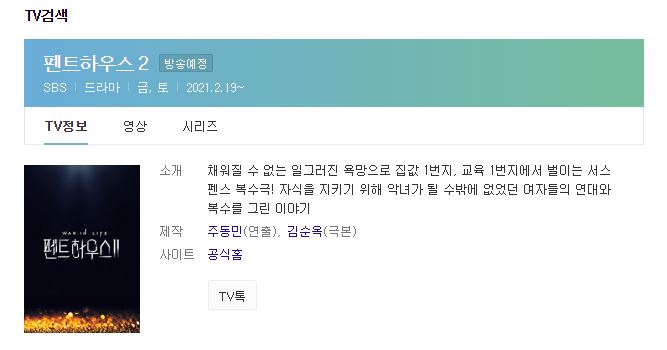 펜트하우스 2는 시간대를 옮겨 2월 19일부터 매주 금, 토 오후 10시에 방송된다고 합니다.