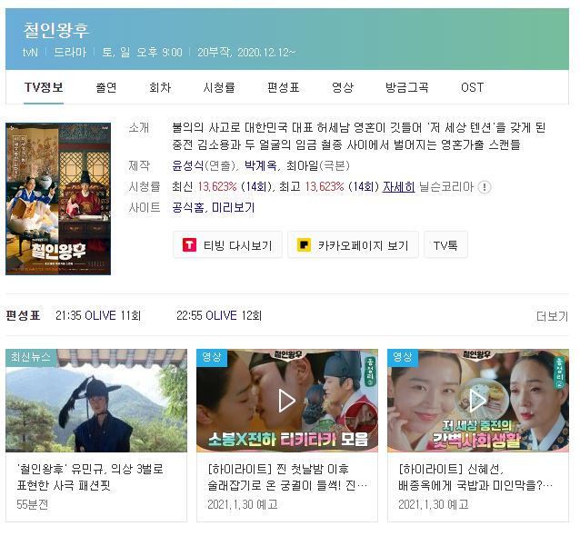 2위 : 철인왕후 (토,일 tvN) 13.623%