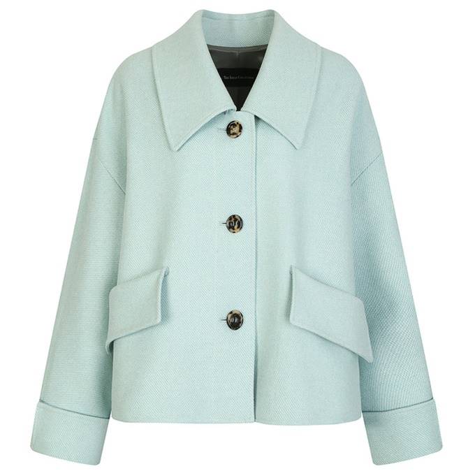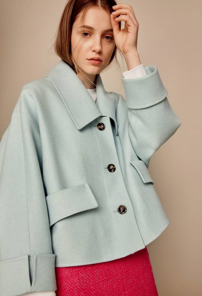 멋스러운 스카이 블루 컬러의 오버사이즈 핏 자켓으로 빅 싱글 카라 디테일을 더해