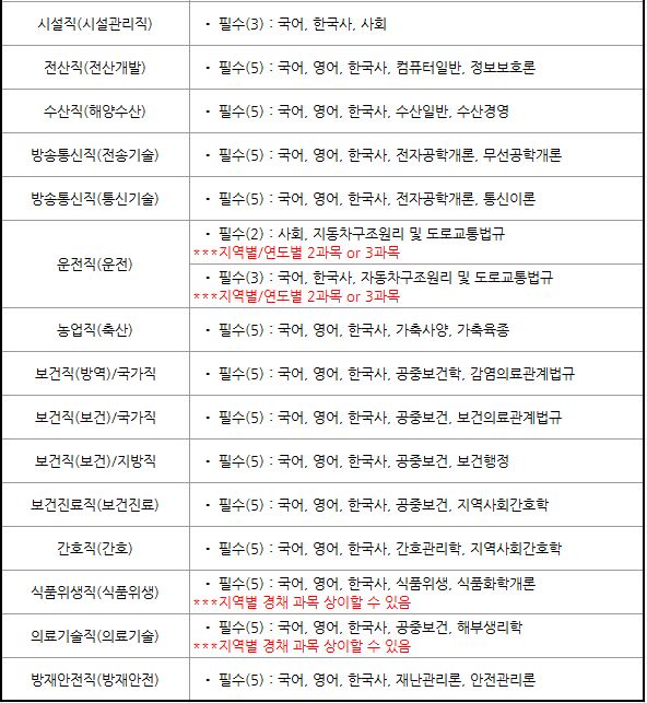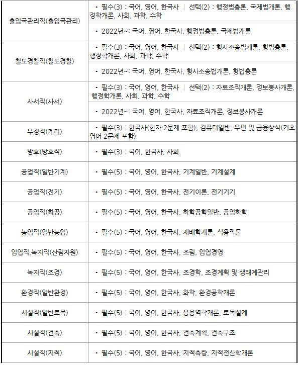 국어, 영어, 한국사, 행정법총론, 행정학개론 이렇게 5과목을 준비하셔야 합니다.