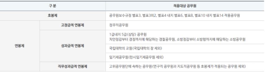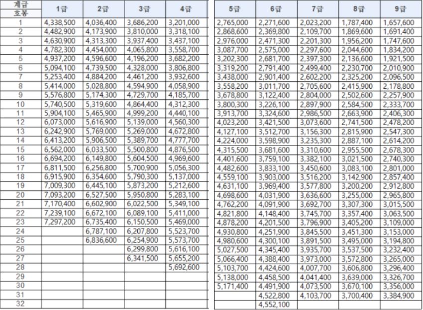 호봉체계에 따른 봉급표는 직종별로 다르게 되어 있고 봉급표에 나오는 봉급 외에 각종 수당이 지급됩니다.