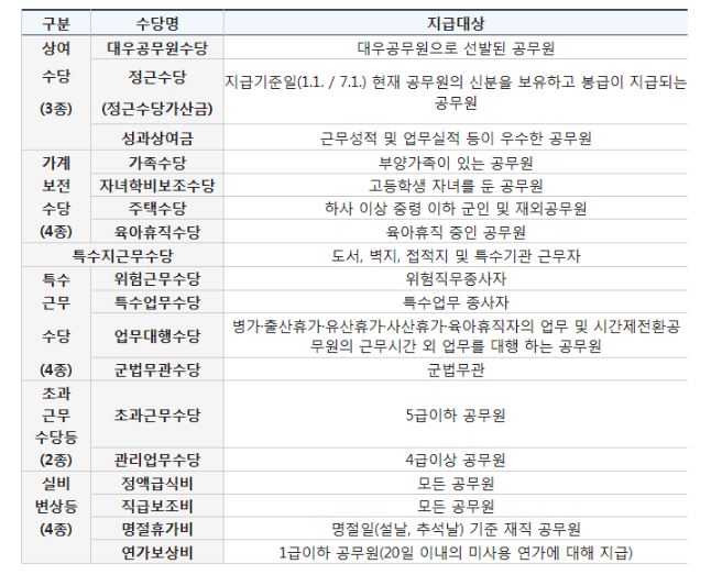 기본적으로 모든 공무원에게 정액급식비(월140,000원), 직급보조비(월 135,000원~75만 원), 명절휴가비(월봉급액의 60%), 연가보상비가 지급됩니다.