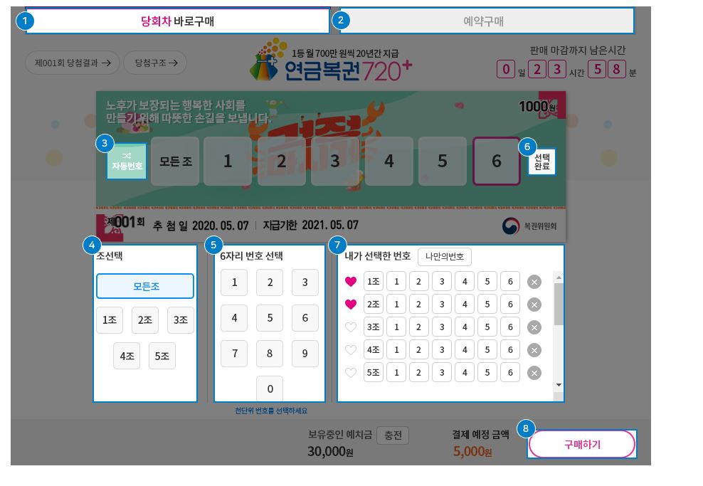 6. 선택완료 : 선택한 조와 6자리 번호를 확정합니다. 선택한 번호가 판매된 경우, 추천 번호를 자동으로