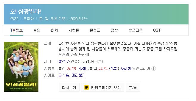 이제 마지막을 향해 달려가는 오! 삼광빌라! 다양한 사연을 안고 삼광빌라에 사는 가족드라마로