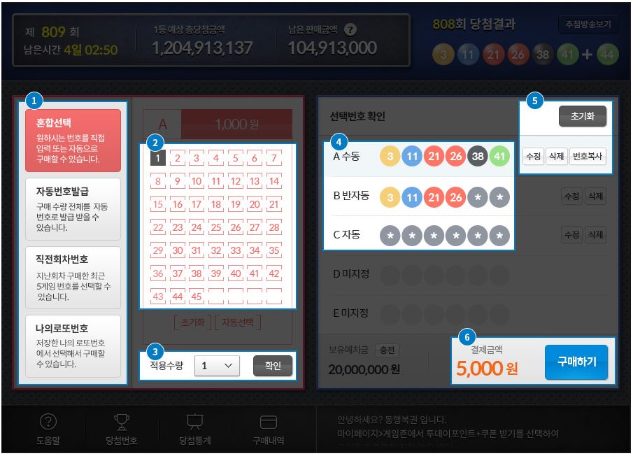 1. 로또번호 선택 방법 : 6개의 번호를 모두 또는 부분적으로 선택할 수 있는 혼합, 시스템 자동발급, 직전 회차 번호 재선택, 저장한 로또번호 중에서 선택할 수 있습니다.