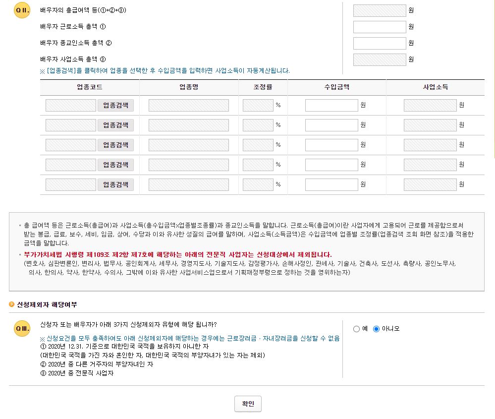 본인 설정에 맞게 칸을 채워넣어주신 후, 확인 버튼을 누르시면 근로장려금 계산을 간편하게 해보시고