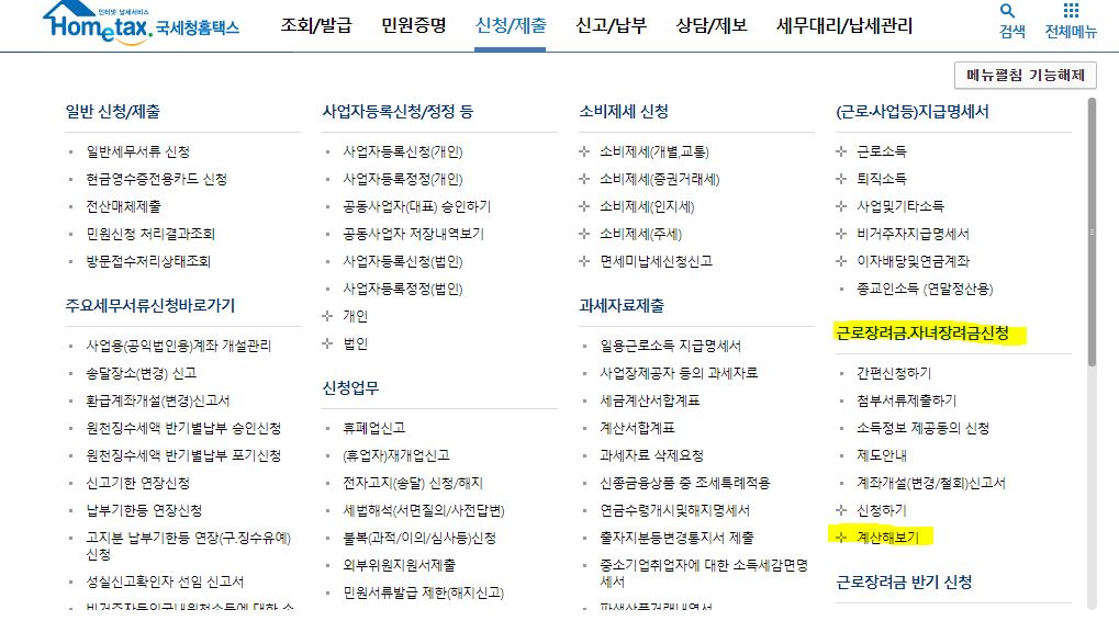근로장려금, 자녀장려금 신청 밑에 '계산해보기'를 클릭하여 주시면 근로장려금 계산을 해보실 수 있습니다.