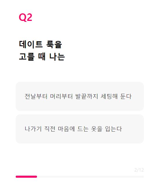 mbti 연애 유형 테스트의 문항은 총 12개로 위와 같이 간단 질문과 함께 2가지 선택지 중 하나를 고르시면 됩니다.