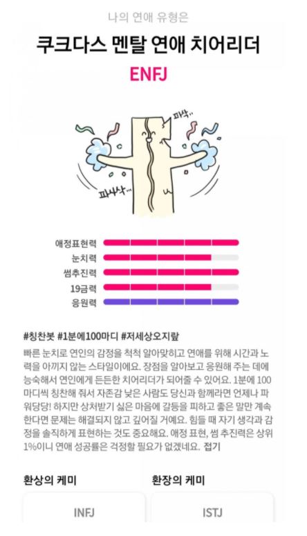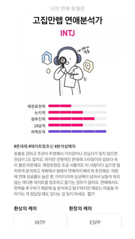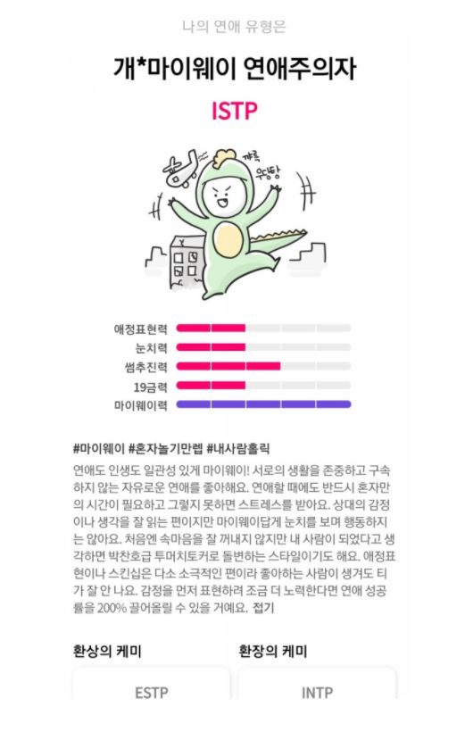 답변을 모두 완료하고 나시면 나의 mbti 유형과 함께 mbti 연애 유형이 제시되며,