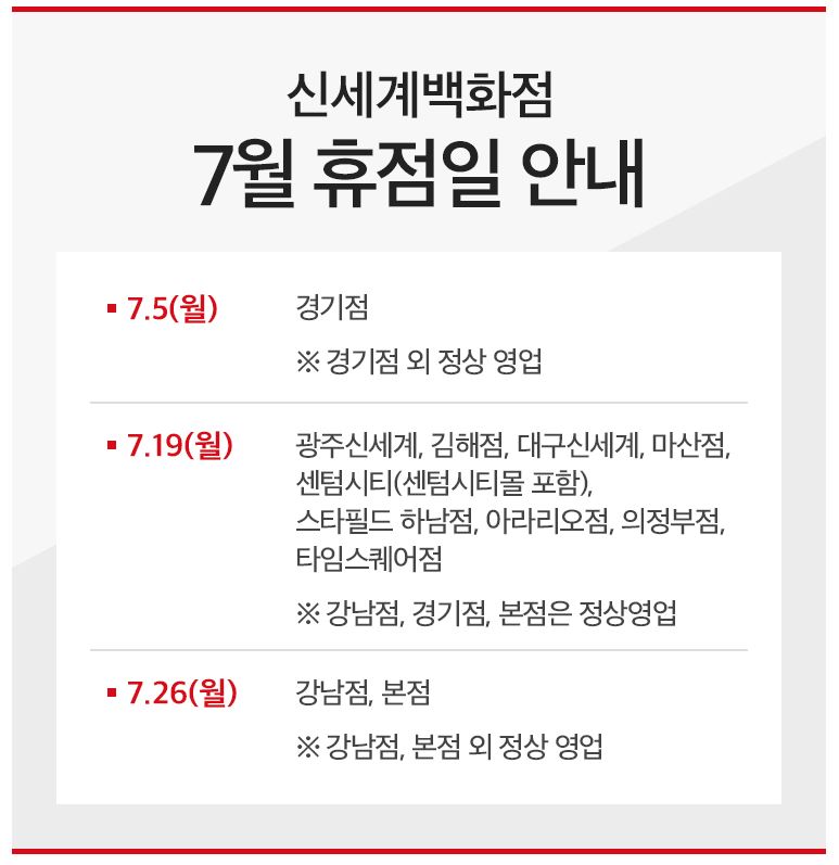 7월 신세계백화점 휴무일 7월 26일 월요일