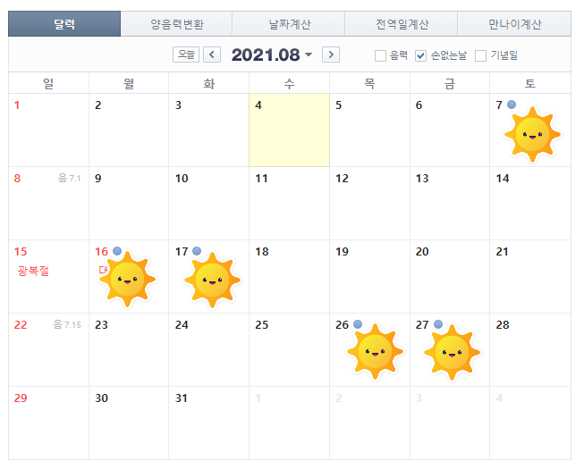 2021년 8월 손 없는 날, 이사하기 좋은날은