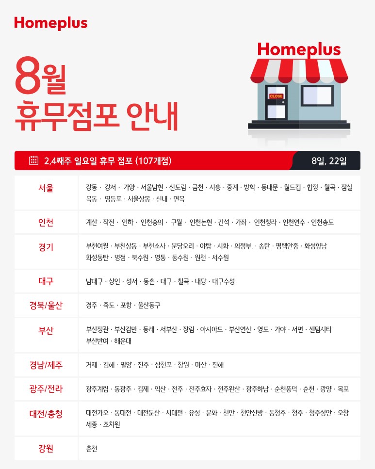 강원 홈플러스 휴무일 : 8월 8일 / 8월 22일 일요일