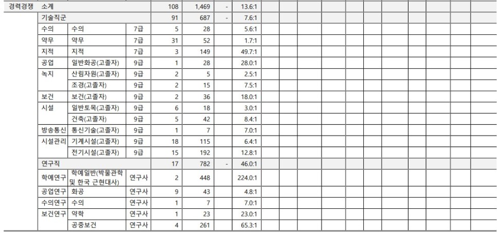 접수 인원은 오히려 증가했지만, 채용인원이 크게 증가하여 경쟁률이 대체적으로 하락하였다고 해요.