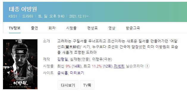 저번주에는 9% 시청률로 사극을 좋아하시는 분이라면 꼭 챙겨보는 주말 드라마 태종 이방원.