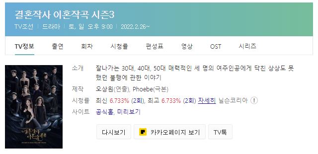 저번주부터 다시 시작된 결혼작사 이혼작곡 시즌3 드라마. 첫 출발부터 시청률이 좋은데요. 이번 시즌3는 어떨지